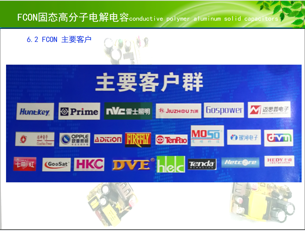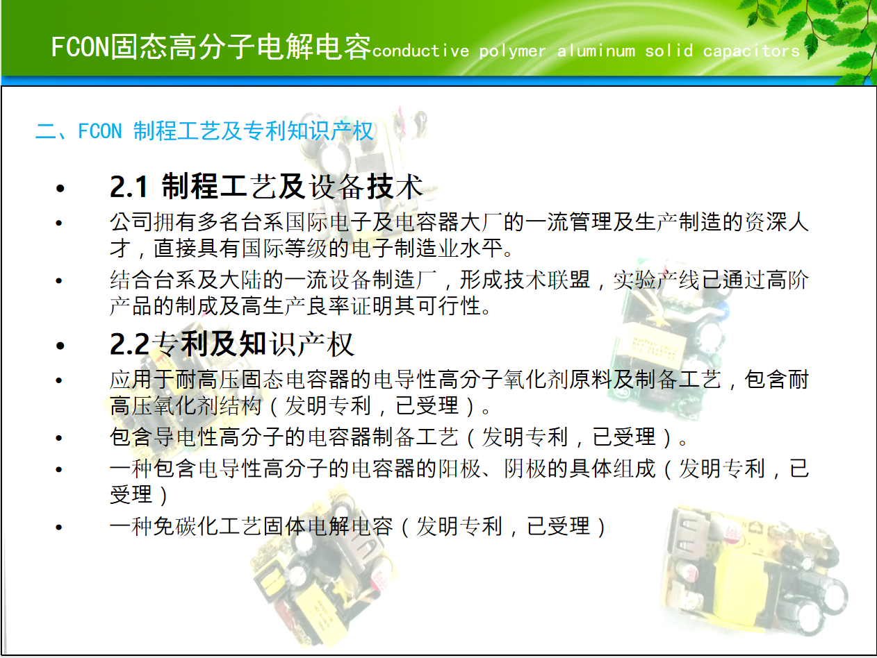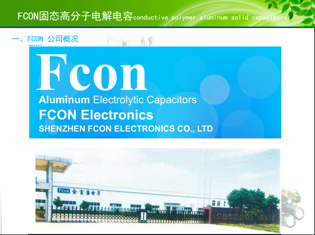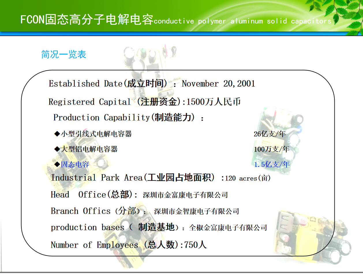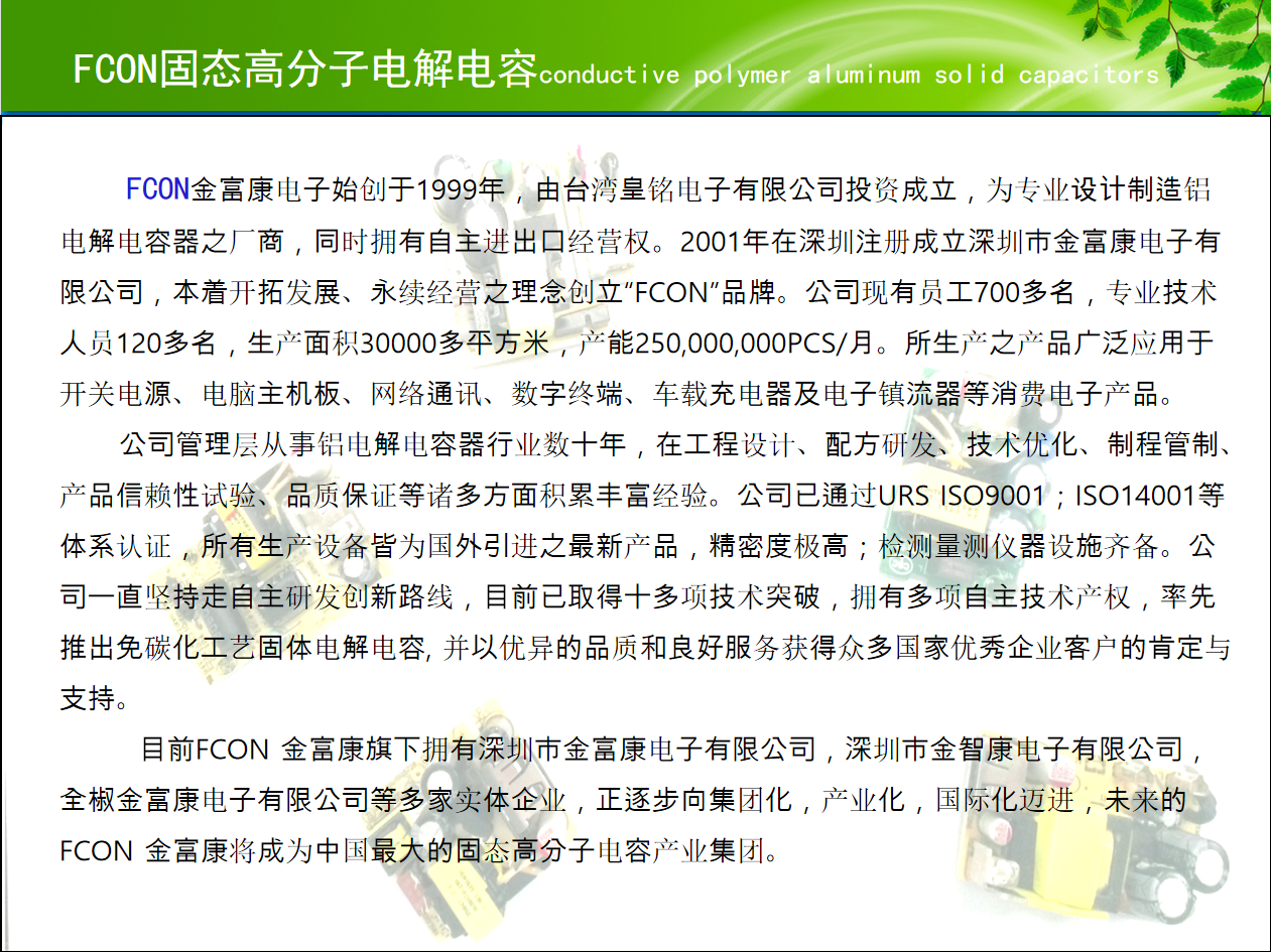 FCON金富康电子始创于1999年,由台湾皇铭电子有限公司投资成立,为专业设计制造铝电解电容器之厂商,同时拥有自主进出口经营权。2001年在深圳注册成立深圳市金富康电子有限公司,本着开拓发展、永续经营之理念创立“FCON”品牌。公司现有员工700多名,专业技术人员120多名,生产面积30000多平方米,产能250,000,000PCS/月。所生产之产品广泛应用于开关电源、电脑主机板、网络通讯、数字终端、车载充电器及电子镇流器等消费电子产品。 公司管理层从事铝电解电容器行业数十年,在工程设计、配方研发、技术优化、制程管制、产品信赖性试验、品质保证等诸多方面积累丰富经验。公司已通过URS ISO9001;ISO14001等体系认证,所有生产设备皆为国外引进之最新产品,精密度极高;检测量测仪器设施齐备。公司一直坚持走自主研发创新路线,目前已取得十多项技术突破,拥有多项自主技术产权,率先推出免碳化工艺固体电解电容, 并以优异的品质和良好服务获得众多国家优秀企业客户的肯定与支持。