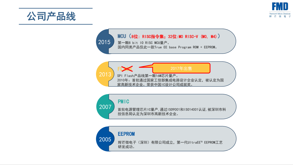 辉芒微是一家定位于“MCU+”的平台型芯片设计企业。公司采用Fabless经营模式,是国内少数同时具备微控制器芯片、电源管理芯片和存储芯片设计能力和大规模量产经验的IC设计企业,也是国内少数具备半导体器件和工艺独立开发能力的IC设计企业。公司自主研发EEPROM工艺,于2005年量产销售EEPROM芯片;其后凭借深厚的技术积累和创新能力,陆续于2007年、2013年、2015年量产推出PMIC芯片、NOR Flash芯片和MCU芯片;构建了覆盖电子设备三大核心功能(程序控制、电源管理、信息存储)的完整芯片产品矩阵,形成了良好的协同效应。公司芯片的性能、稳定性、可靠性等指标比肩国内外知名品牌。