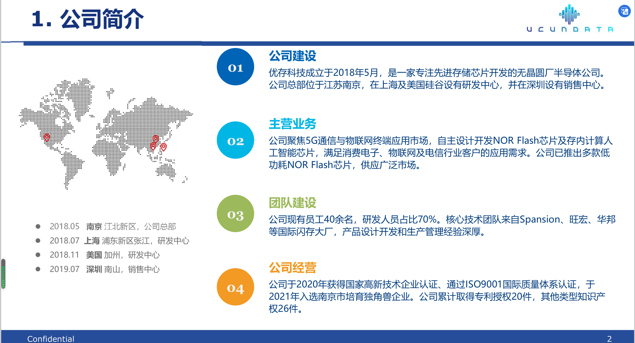 优存科技成立于2018年5月,是一家专注先进存储芯片开发的无晶圆厂半导体公司。公司总部位于江苏南京,在上海及美国硅谷设有研发中心,并在深圳设有销售中心。公司聚焦5G通信与物联网终端应用市场,自主设计开发NOR Flash芯片及存内计算人工智能芯片,满足消费电子、物联网及电信行业客户的应用需求。公司已推出多款低功耗NOR Flash芯片,供应广泛市场。公司于2020年获得国家高新技术企业认证、通过ISO9001国际质量体系认证,于